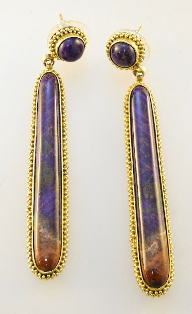 Pair of Sugilite 18K & 22K Gold Earrings, 2 3/4" high.