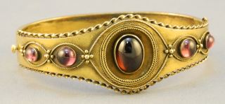 Victorian Etruscan Revival Gold Tone & Amethyst Cabochon Hinged Bracelet, Unmarked, 14.63