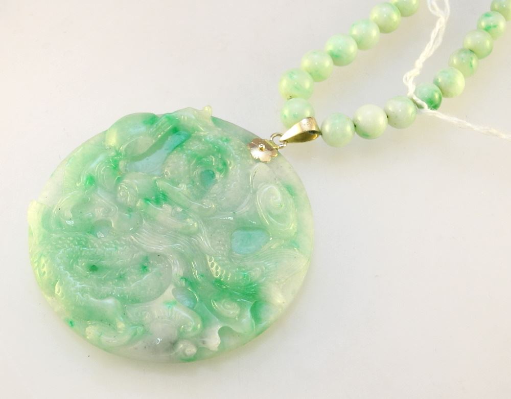 LOT 283 Jade Pendant on Graduated Bead Necklace (Clasp Unmarked), Bail Marked 18K. Estimate: $100 - $200 Sold For: $120 Auction Date: Tuesday, July 19 2022 at 6:00 PM