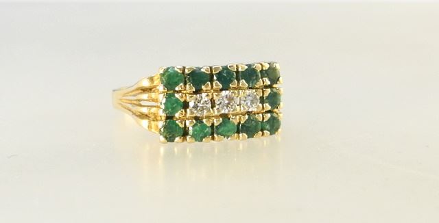 14K (Marked) Yellow Gold Ring with 3 Diamonds & 12 Emeralds, Size 8, TW:5.9 Grams.