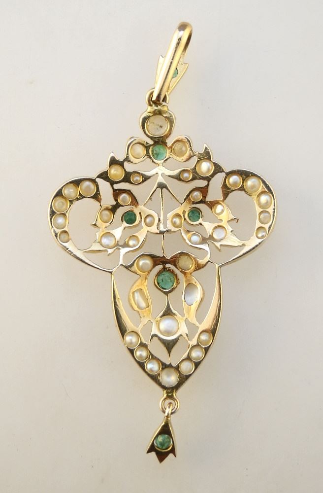 LOT 32 Antique 14K Pendant Set with Emeralds & Pearls. Estimate: $300 - $400 Sold For: $400 Auction Date: Tuesday, July 19 2022 at 6:00 PM