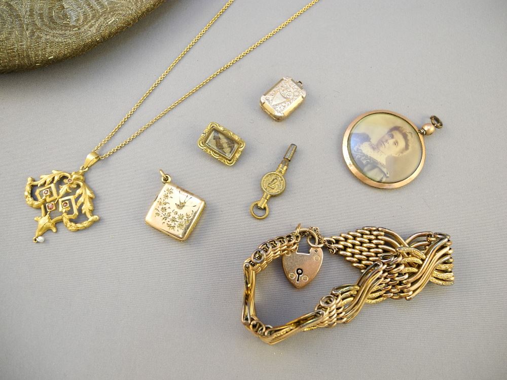 Group of Antique Gold-Tone Jewellery in Evening Bag.