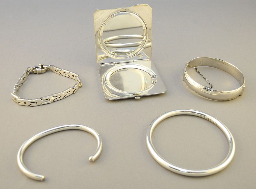 LOT 179 3 Sterling Silver Bracelets & a Compact, Largest 3" Diameter, TW:168 Grams. Estimate: $100 - $150 Auction Date: Tuesday, July 19 2022 at 6:00 PM
