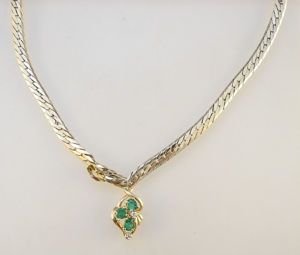 LOT 131 10K (Clasp Marked) Yellow Gold Diamond & Emerald Necklace, 16 1/2" Length, TW:16 Grams. Estimate: $300 - $400 Auction Date: Tuesday, July 19 2022 at 6:00 PM