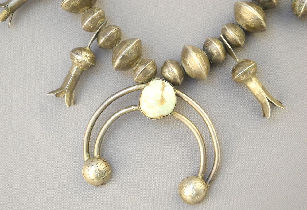 LOT 226 Navajo Coin Silver Squash Blossom Necklace, 26" length, 473 grams. Estimate: $1,000 - $1,500 Sold For: $800 Auction Date: Tuesday, September 27 2022 at 6:00 PM