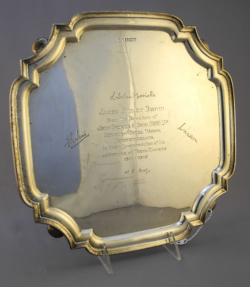 LOT 154 Walker & Hall Sheffield Hallmarked Sterling Silver Tray with Dedication 12" diameter, 28.7oz. Estimate: $400 - $600 Sold For: $385 Auction Date: Tuesday, September 27 2022 at 6:00 PM