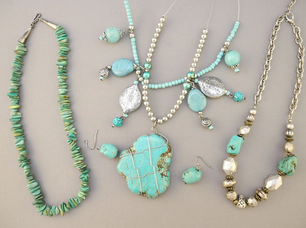 Three Various Turquoise Necklaces & a Pair of Earrings with Glass & White Metal Components