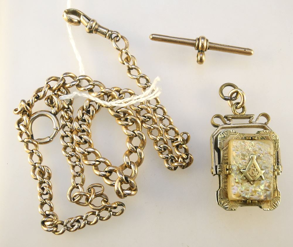 LOT 137 9K (Marked) Gold Watch Fob (29.03Gr. Separated) & a Unmarked Masonic Pendant. Estimate: $400 - $500 Sold For: $400 Auction Date: Tuesday, September 27 2022 at 6:00 PM