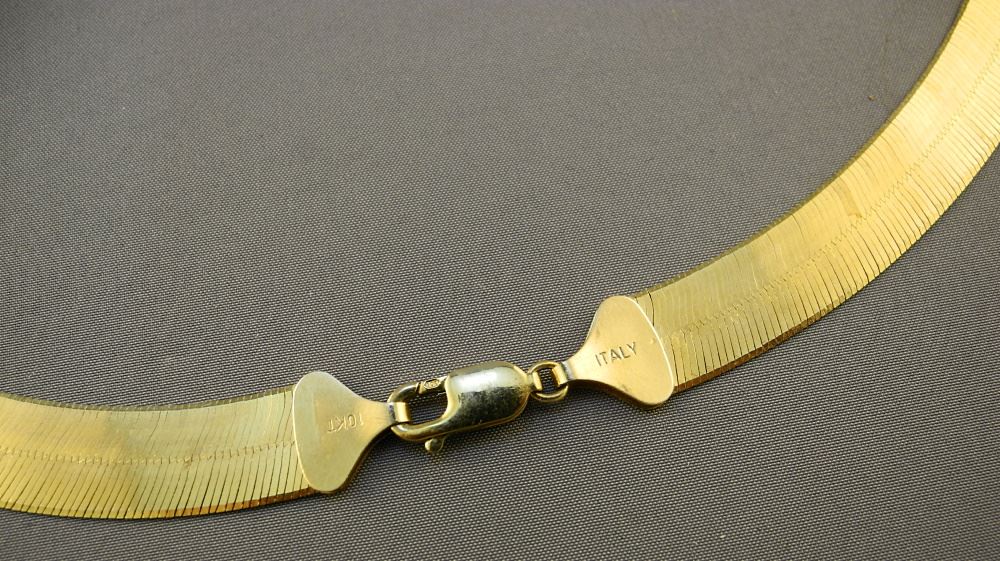 LOT 70 10K (Marked) Herringbone Necklace, 20" Length, .23 Grams with Box. Estimate: $400 - $500 Sold For: $465 Auction Date: Tuesday, September 27 2022 at 6:00 PM