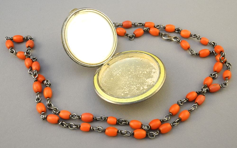 LOT 219 Austrian Sterling Silver & Enamel Egyptian Revival Compact on Coral Bead Chain, TW:111.61 Gram Estimate: $200 - $300 Auction Date: Tuesday, September 27 2022 at 6:00 PM