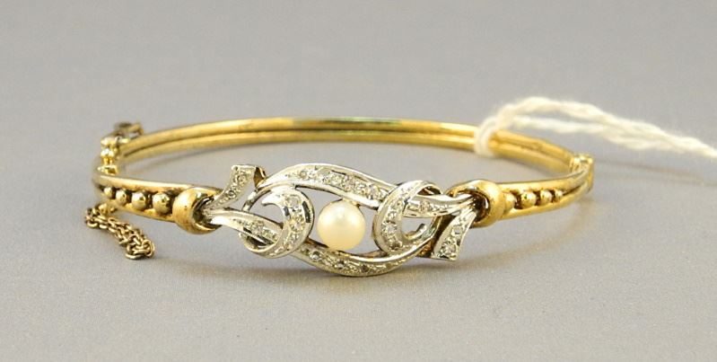 Unmarked Yellow Gold Tone Pearl & Diamond Hinged Bracelet, TW:12.32 Grams.