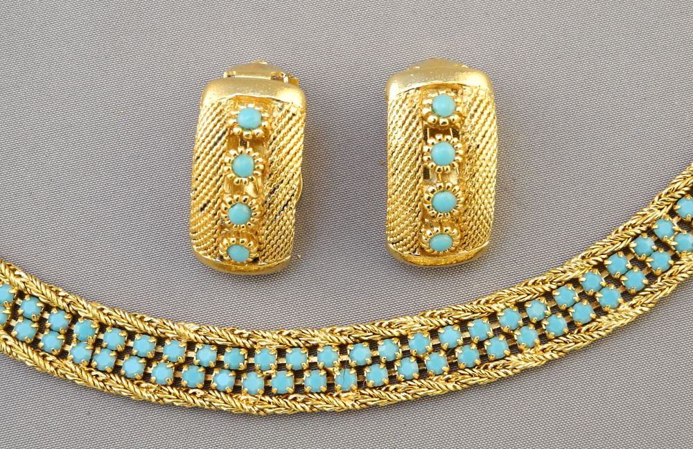 LOT 92 Gold Tone & Turquoise Necklace & a Similar Pair of Earrings. Estimate: $100 - $200 Sold For: $120 Auction Date: Tuesday, September 27 2022 at 6:00 PM