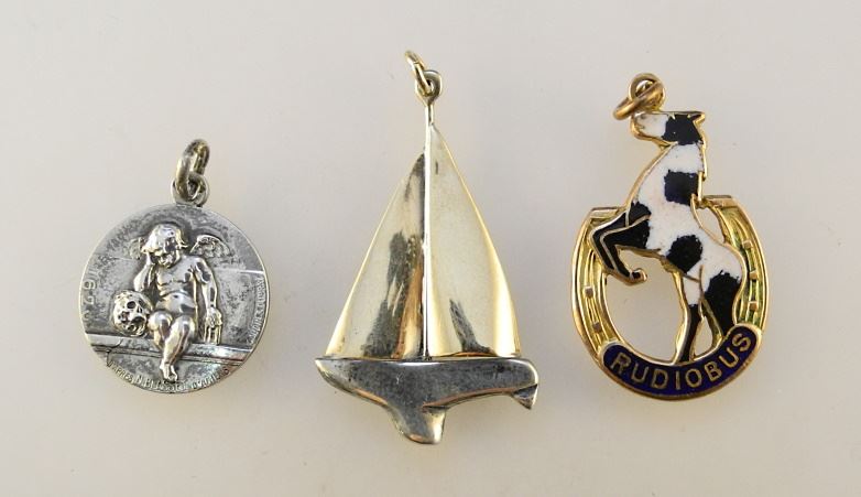 LOT 215 3 Various Charms: Sailboat/ Amiens/ Rudibus (9K), TW:8.56 Grams. Estimate: $50 - $60 Sold For: $62 Auction Date: Tuesday, September 27 2022 at 6:00 PM