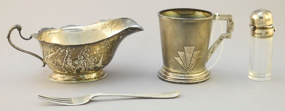 Hallmarked Sterling Silver Group: Sauce Boat/ Art Deco Cup/ Fork/ Scent Bottle, TW:285 Grams