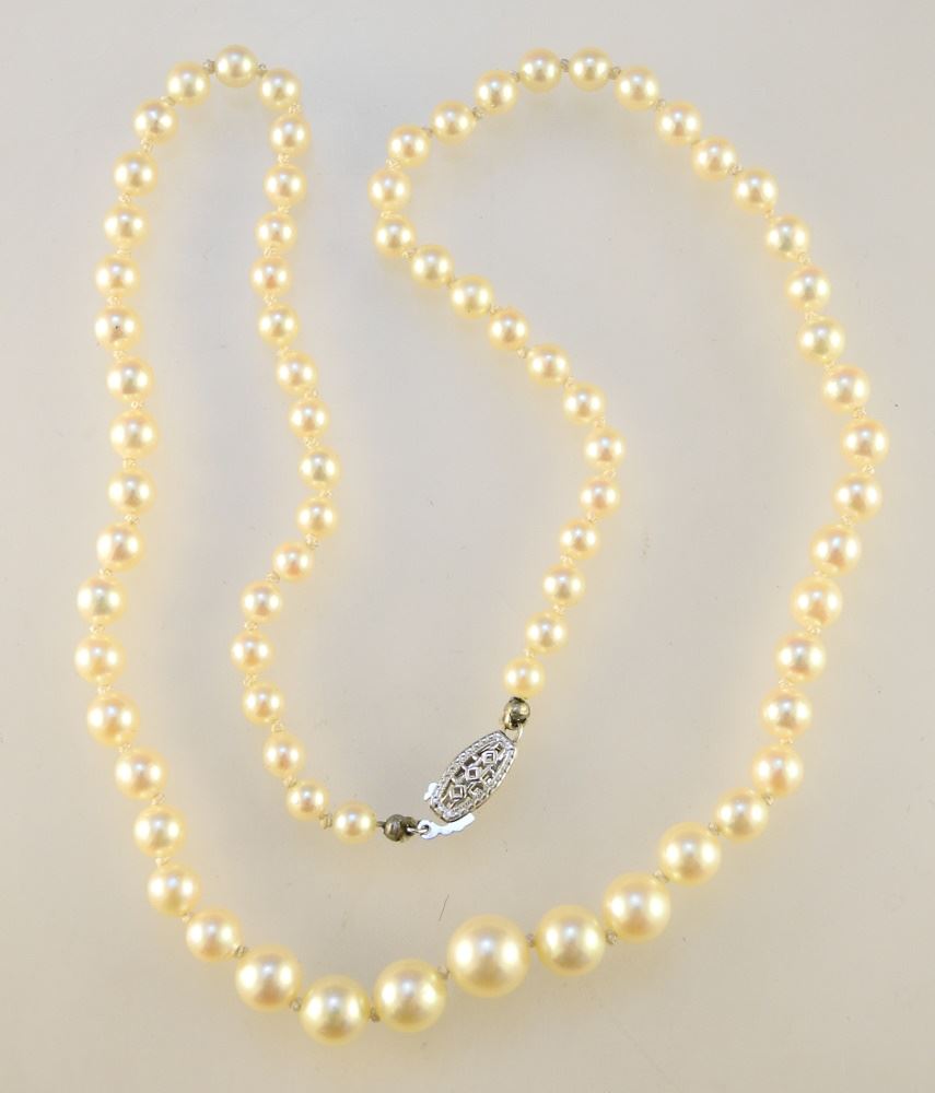 Graduated Cultured Pearl Necklace with 10K (Marked) White Gold Clasp, 16" Length.
