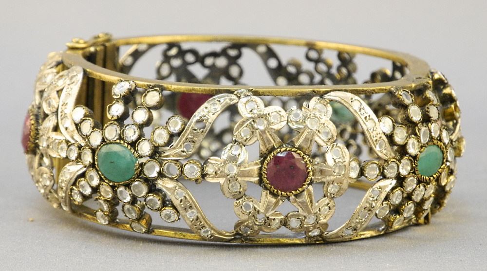 LOT 276 Genuine Ruby, Emerald & Rock Crystal Wide Bracelet. Estimate: $100 - $150 Sold For: $250 Auction Date: Tuesday, December 06 2022 at 6:00 PM