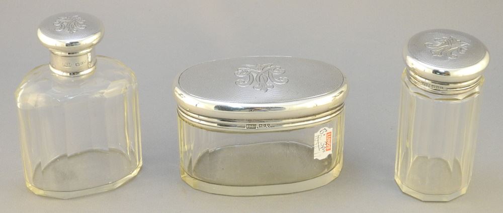 3 Hallmarked Sterling Silver Capped Crystal Dresser Jars, Monogrammed M.