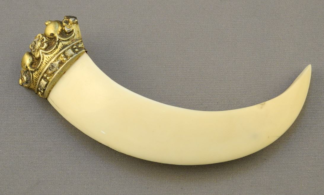 LOT 162 Boar Tusk Pin with Silverplate Crown, 4" H. Estimate: $60 - $100 Sold For: $45 Auction Date: Tuesday, March 07 2023 at 4:00 PM