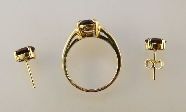 LOT 170 14K (Marked) Yellow Gold & Garnet Ring with Pair of Unmarked Earrings, 3.3gr. Estimate: $120 - $180 Auction Date: Tuesday, March 07 2023 at 4:00 PM