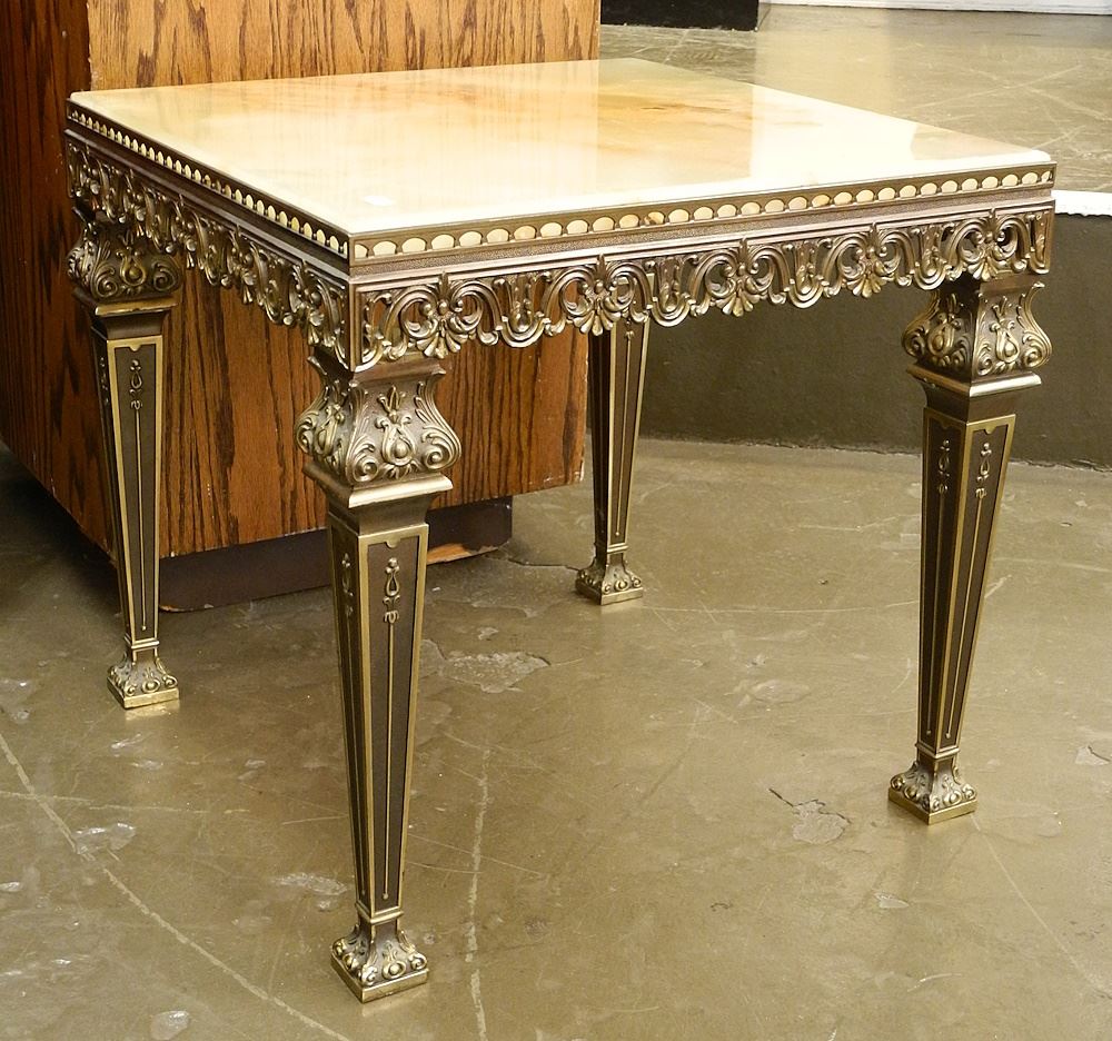 LOT 252 Onyx & Cast Brass Low Table, 18 5/8 x 33 3/8" Diam. & Similar Lamp Table 19 x 20 1/4 x 20 1/4". Estimate: $100 - $200 Sold For: $180 Auction Date: Tuesday, September 19 2023 at 4:00 PM