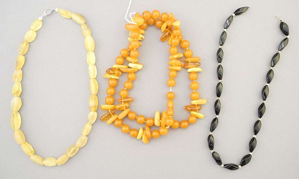 Collection of 6 Amber / Jade / Hardstone + Other Necklaces, 15-30"L