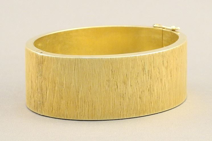 LOT 34 14K Gold Custom Made Lady's Bracelet 25mm W., 78.4 Grams. Estimate: $3,000 - $4,000 Sold For: $3,750 Auction Date: Tuesday, December 05 2023 at 4:00 PM