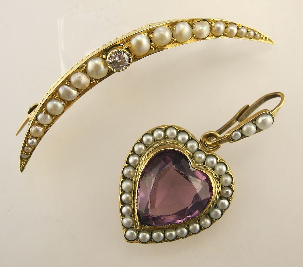 2 Seed Pearl Items: Crescent Brooch (4Gms) & Heart Pendant (4.3Gms). (18/25).
