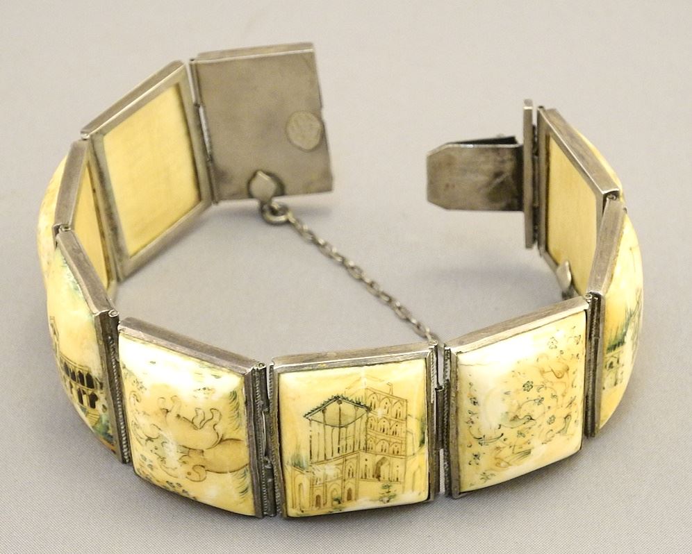 LOT 166 Persian Tile Bracelet, with Silver-Toned Metal & Hand Painted Scenes, No Export. Estimate: $60 - $100 Auction Date: Tuesday, December 05 2023 at 4:00 PM