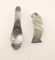 2 Northwest Coast Silver Carvings: Ladle / B.Neel & T. Bird / D. Brotchie, 7.5 Grams.