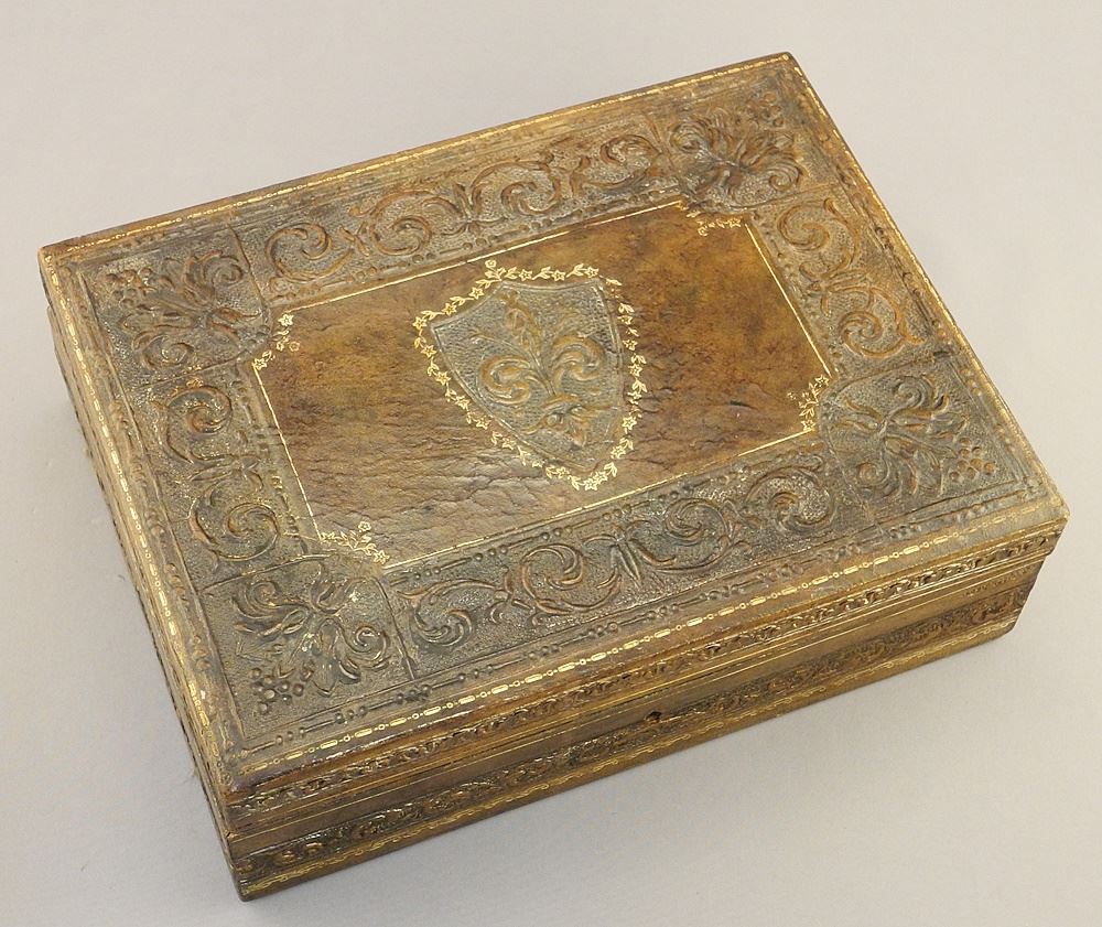 Antique French Fleur de Lis Embossed Leather Jewelry Box, 9 1/2 x 7".