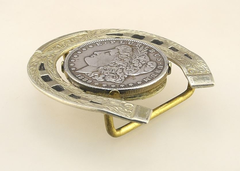 White Metal Horseshoe Belt buckle set with 1889 Morgan Dollar, 2 3/8"H , 1 1/2" Keeper.