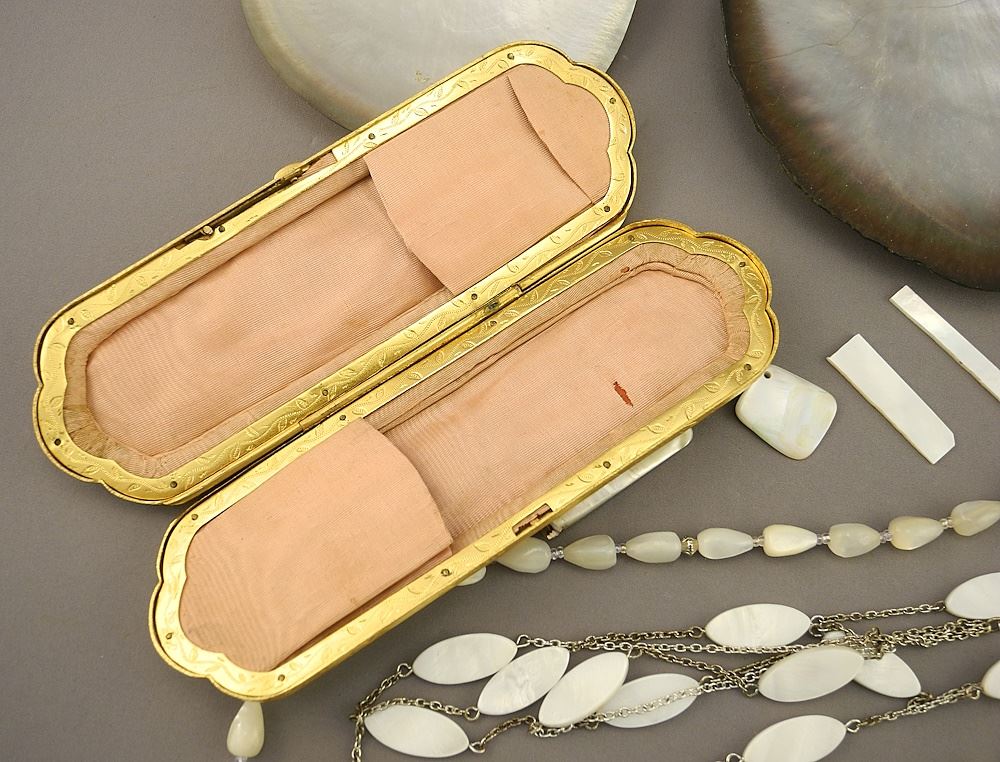 LOT 157 Mother of Pearl Jewelry Collection & Spectacle Case, Shells, Pocket Knife, etc. Estimate: $60 - $150 Sold For: $50 Auction Date: Tuesday, December 05 2023 at 4:00 PM