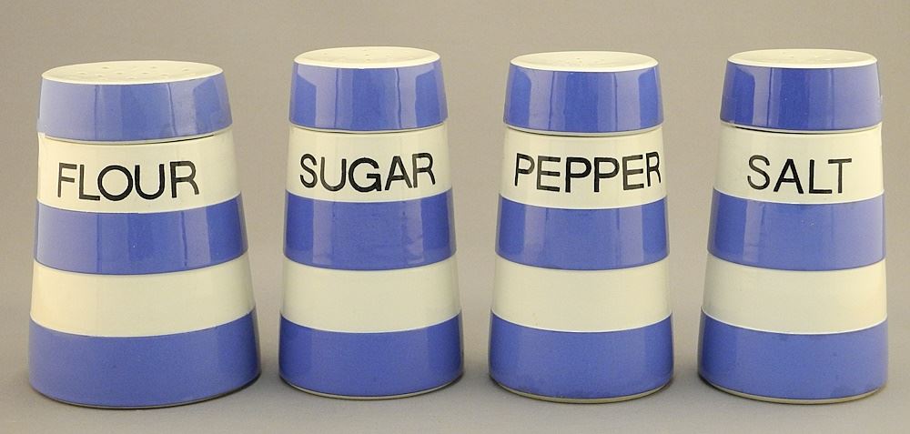 LOT 48 4 Cornish Kitchenware Casters: Flour / Salt / Pepper / Sugar, 5 - 5 1/8"H. Estimate: $80 - $100 Sold For: $60 Auction Date: Tuesday, December 05 2023 at 4:00 PM
