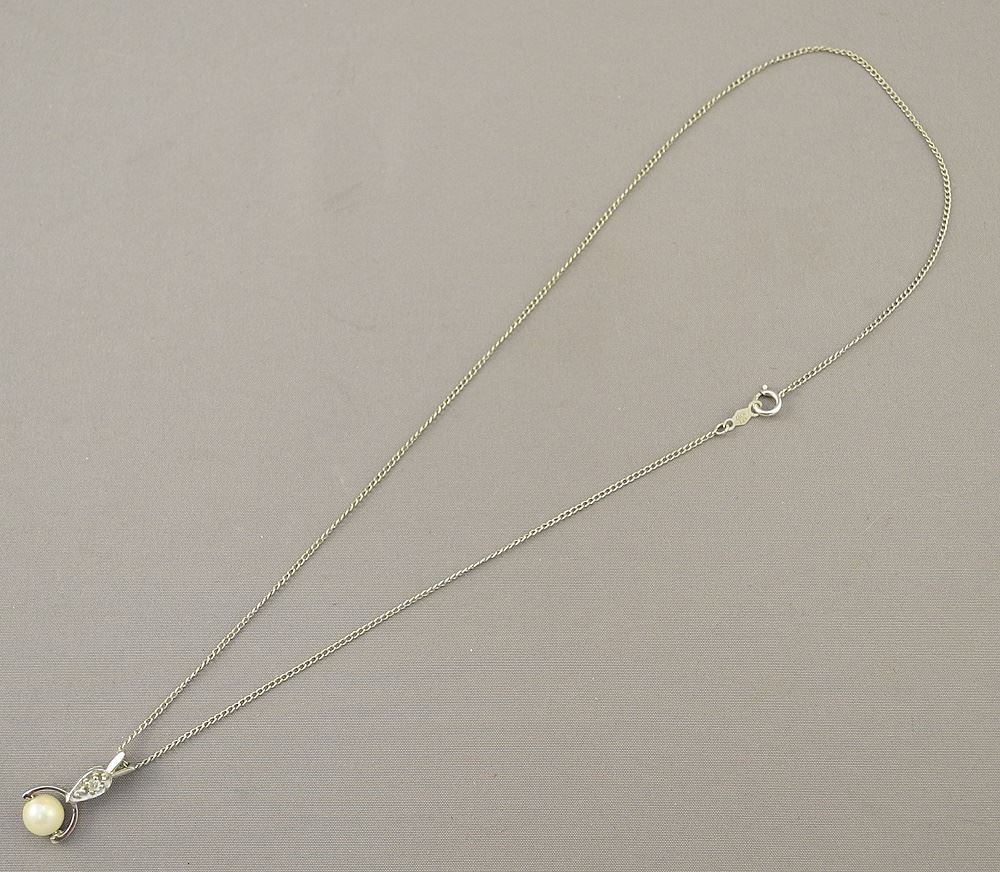 LOT 278 14K (Marked) White Gold Pearl & White Stone Necklace, 2.35 Grams, 14 1/2"L. Estimate: $100 - $150 Sold For: $100 Auction Date: Tuesday, December 05 2023 at 4:00 PM