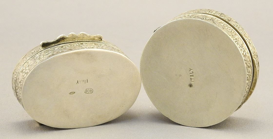 LOT 200 2 Italian Pill Boxes, / 1 Marked (.800) / 1 Unmarked, 1 1/2 & 1 3/8"W , 27.9 Grams. Estimate: $100 - $150 Sold For: $100 Auction Date: Tuesday, December 05 2023 at 4:00 PM