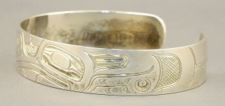 LOT 212 Kwagiulth Silver "Frog" Cuff Bracelet, 19 Grams, 2 1/4"W. Estimate: $180 - $240 Sold For: $160 Auction Date: Tuesday, December 05 2023 at 4:00 PM