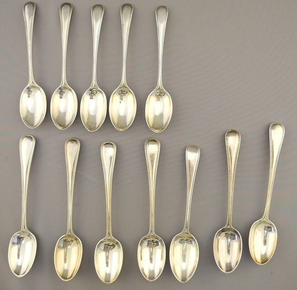 12 Hallmarked Silver Spoons in 2 Sizes, 4 7/8" - 5 7/8"L, 331 Grams.