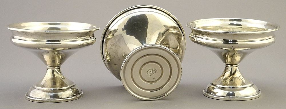 International Sterling Glass Dish with 3 Footed Dishes & Salt & Pepper.