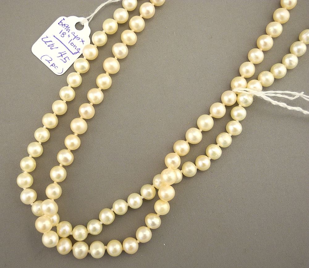 2 Cultured Pearl Necklaces, both 18" L, 6-6.5mm Diameter, One 14K Gold Clasp, One Silver Clasp.