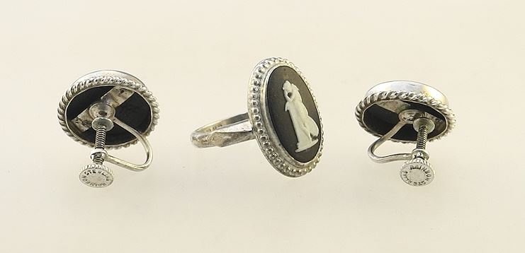 Wedgwood Jasperware Box with Ring (Size 5 1/2) & Earrings, Box signed Lord Wedgwood 1983.