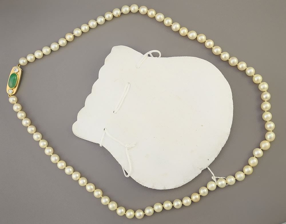 LOT 14 Strand of Uniform Cultured Pearls (9-9.5mm) with 18K (marked) Jade & Diamond Clasp, 29"L, 99.96 Estimate: $6,000 - $7,500 Auction Date: Tuesday, April 16 2024 at 4:00 PM