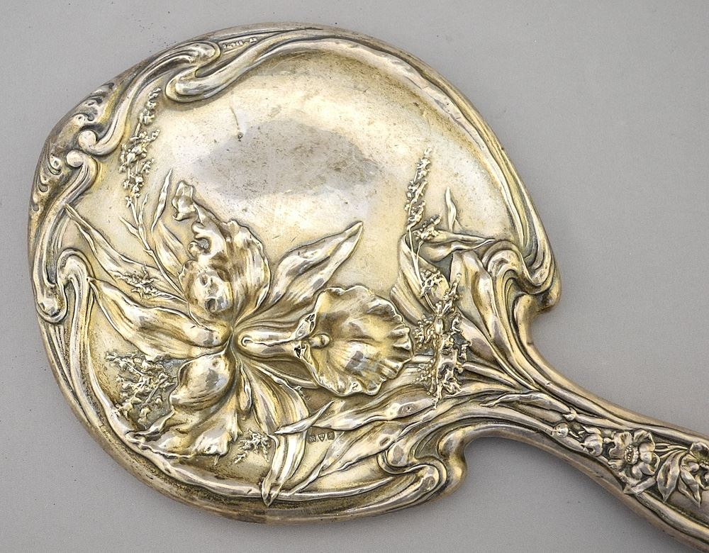Art Nouveau Hallmarked Silver Hand Mirror, 11 5/8"H, TW 426 Grams.