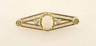 LOT 54 14K (marked) Yellow Gold & Opal Brooch, 2.2 Grams, 1 1/4"W. Estimate: $150 - $200 Sold For: $90 Auction Date: Tuesday, April 16 2024 at 4:00 PM
