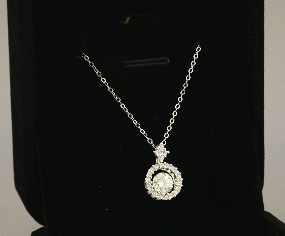LOT 260 Sterling Silver 1 Carat Moissanite Diamond Floating Halo Necklace with Report. Estimate: $80 - $120 Auction Date: Tuesday, April 16 2024 at 4:00 PM