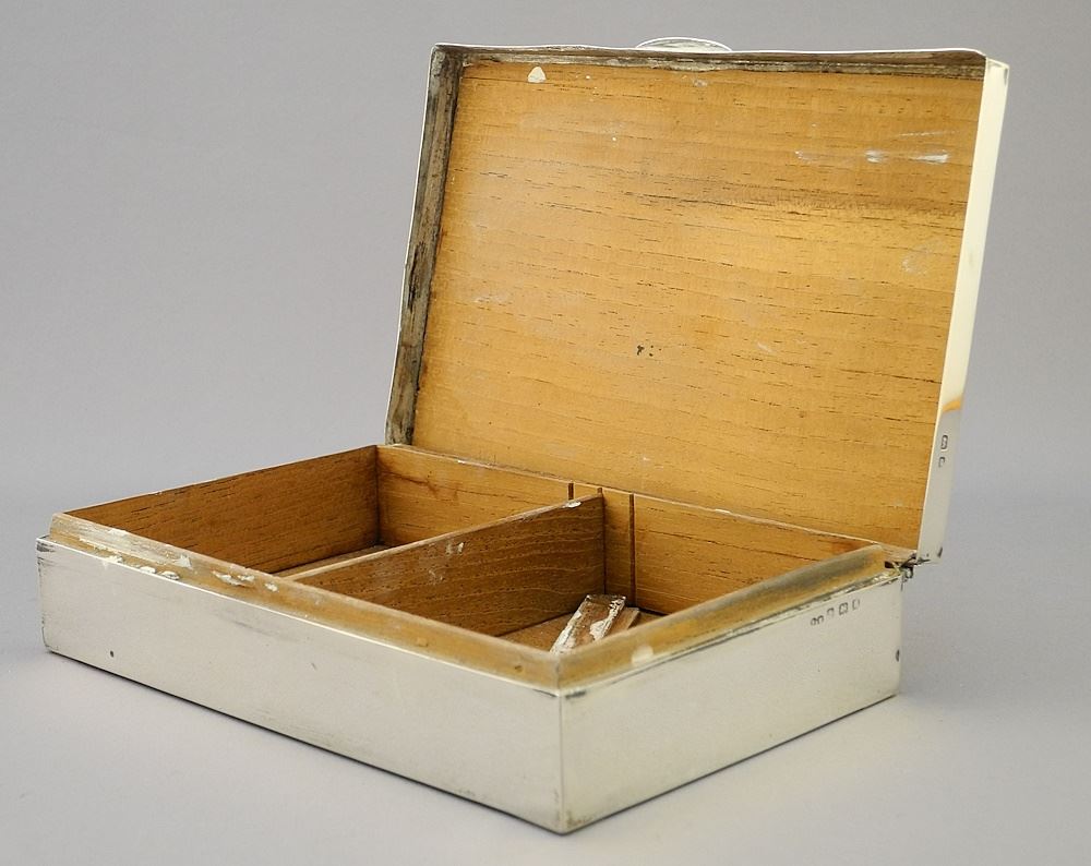 LOT 279 Hallmarked Silver Cigarette Box, TW 508 Grams, 1 1/2" x 6 3/4" x 4 1/2". Estimate: $80 - $120 Sold For: $150 Auction Date: Tuesday, April 16 2024 at 4:00 PM
