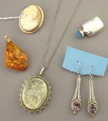 LOT 284 Mexican Silver (marked) Scent Bottle with Unmarked Locket / Earrings / Cameo / Amber Bracelet. Estimate: $60 - $100 Sold For: $80 Auction Date: Tuesday, April 16 2024 at 4:00 PM