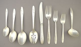 LOT 7 8 Place Settings Wallace "Dawn Star" Sterling Flatware, Apx: Solid 1256, Weighted 673 Grams. Estimate: $1,250 - $1,500 Sold For: $1,200 Auction Date: Tuesday, April 16 2024 at 4:00 PM