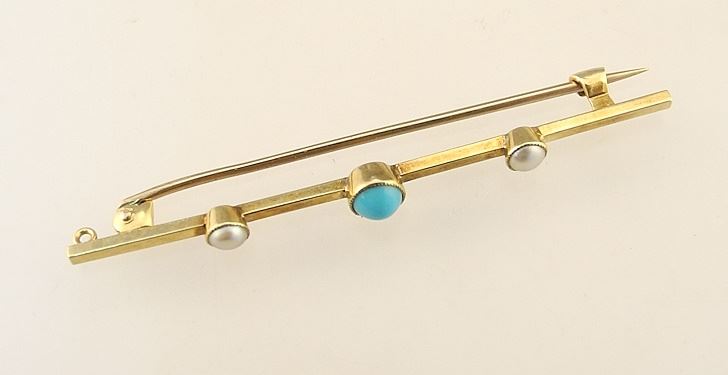 15ct (marked) Yellow Gold Turquoise & Pearl Bar Brooch, 2 1/4"L, 2.68gm.