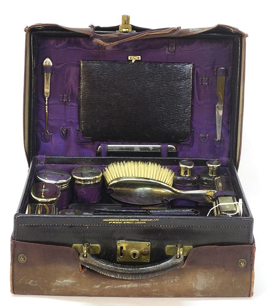 LOT 274 Goldsmiths & Silversmiths Co. Hallmarked Silver Dressing Case, 5 3/8" x 13 1/8" x 9". Estimate: $350 - $450 Sold For: $425 Auction Date: Tuesday, April 16 2024 at 4:00 PM