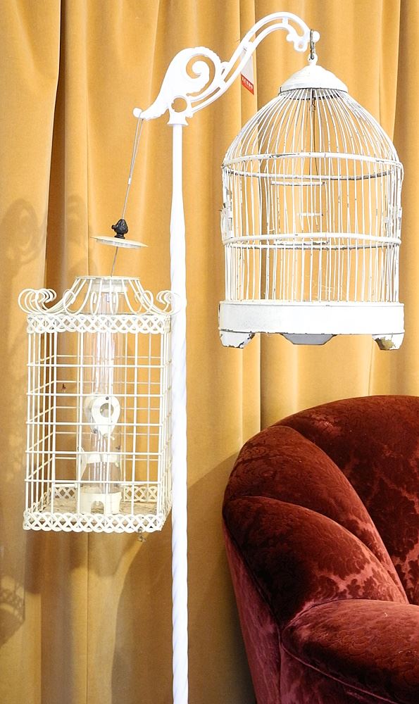 LOT 46 2 Vintage Bird Cage & Feeder with White Lamp Standard, 59"H. Estimate: $50 - $60 Auction Date: Tuesday, April 16 2024 at 4:00 PM